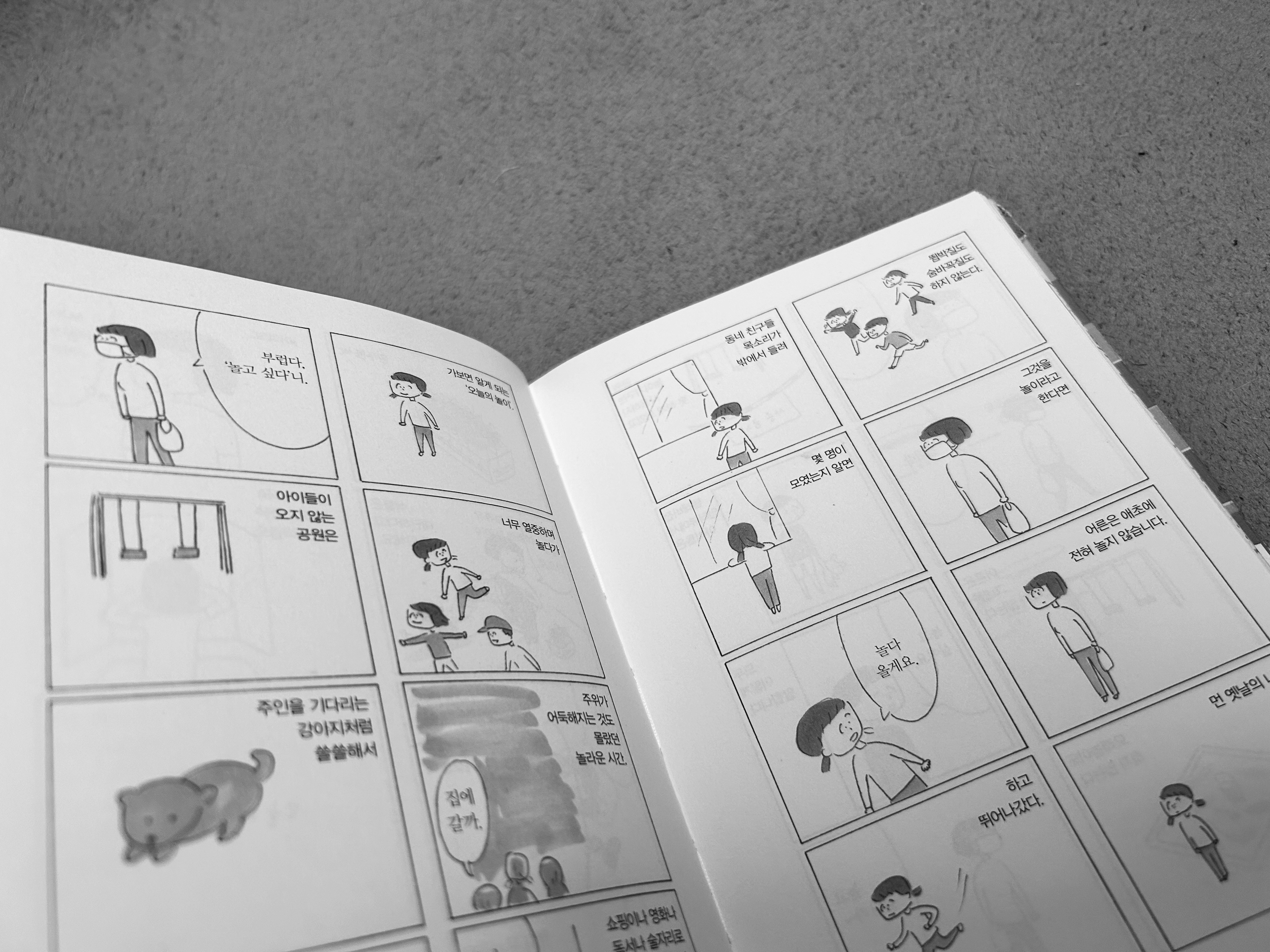 “놀이가” / “뭐더라.” / 어른은 그네를 타지 않는다. / 모래놀이도 하지 않는다. / 뜀박질도 숨바꼭질도 하지 않는다. / 그것을 놀이라고 한다면 / 어른은 애초에 전혀 놀지 않습니다. / 199p