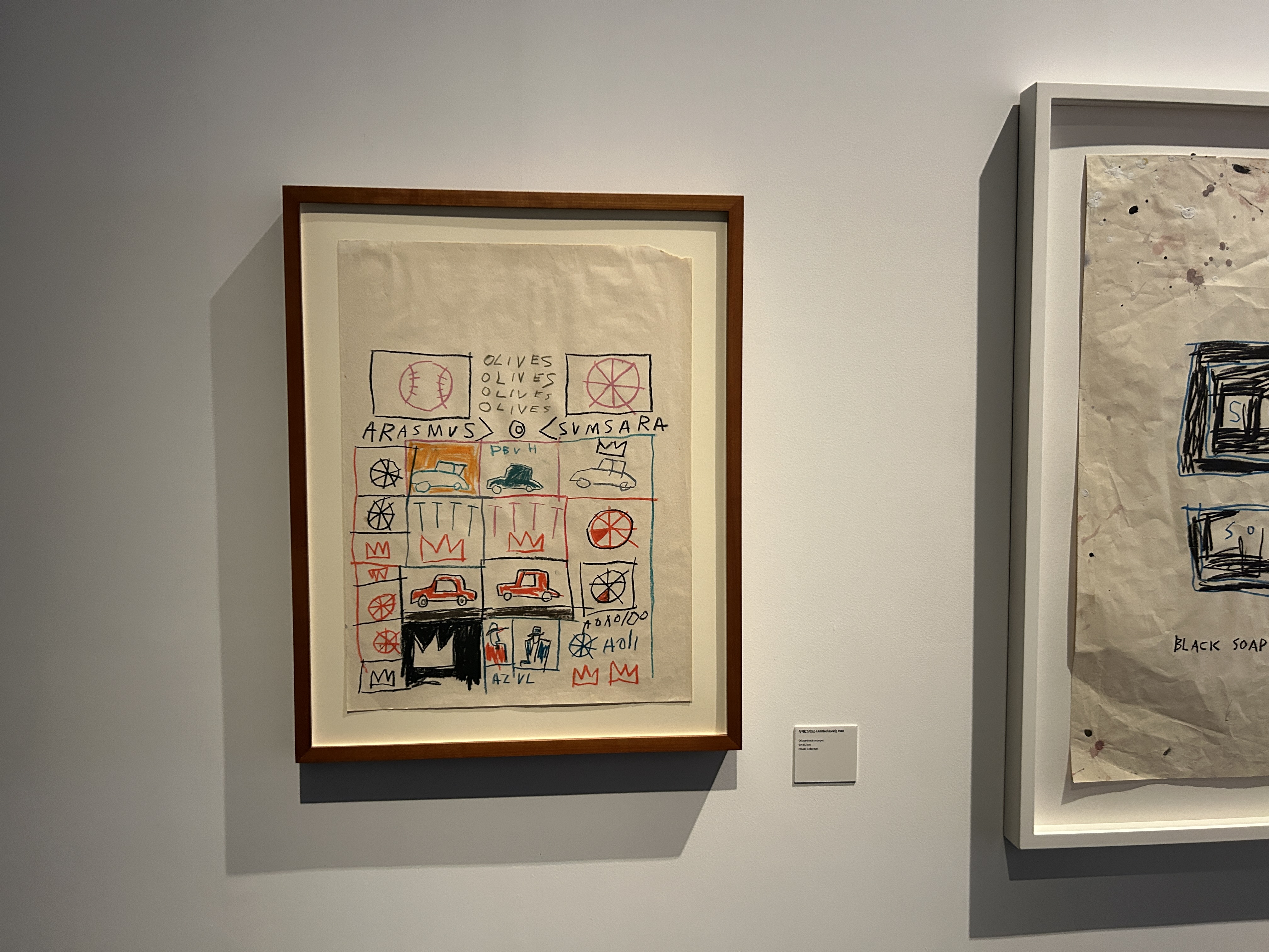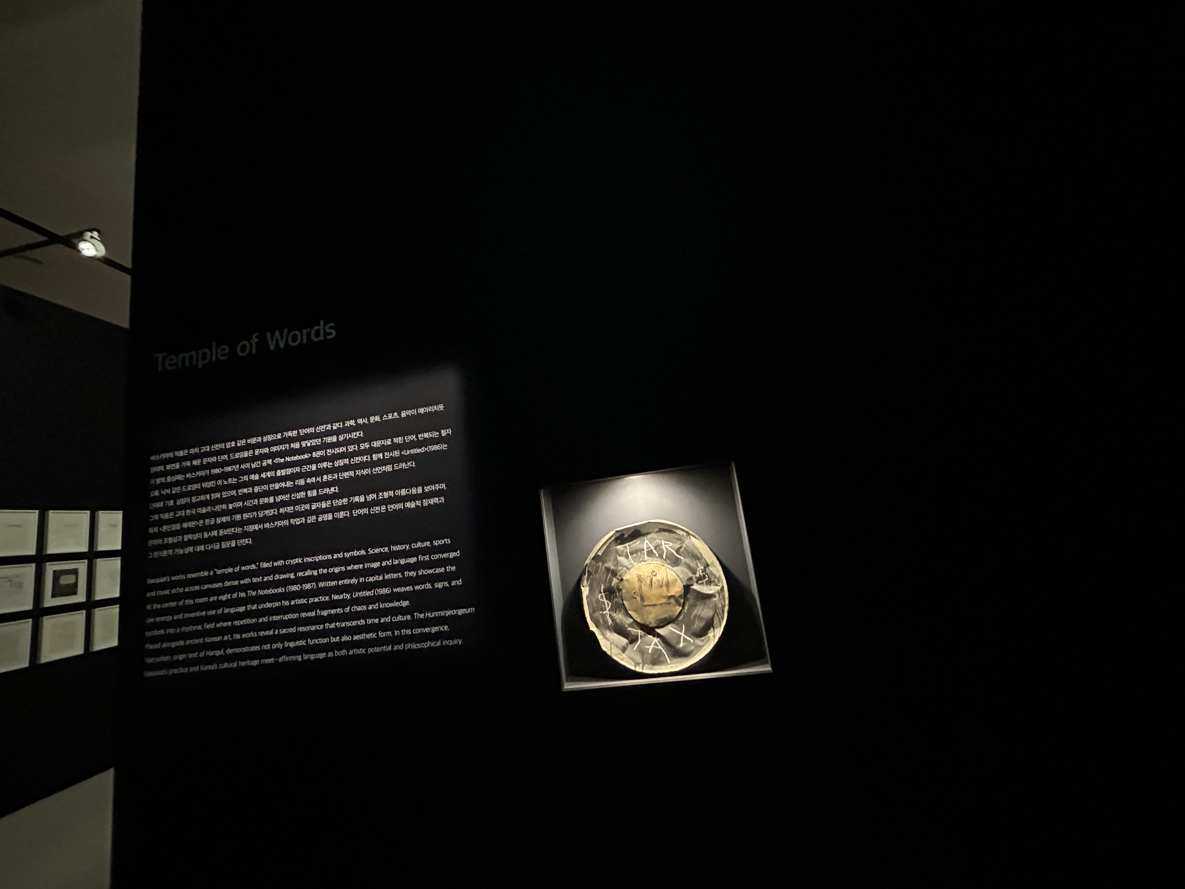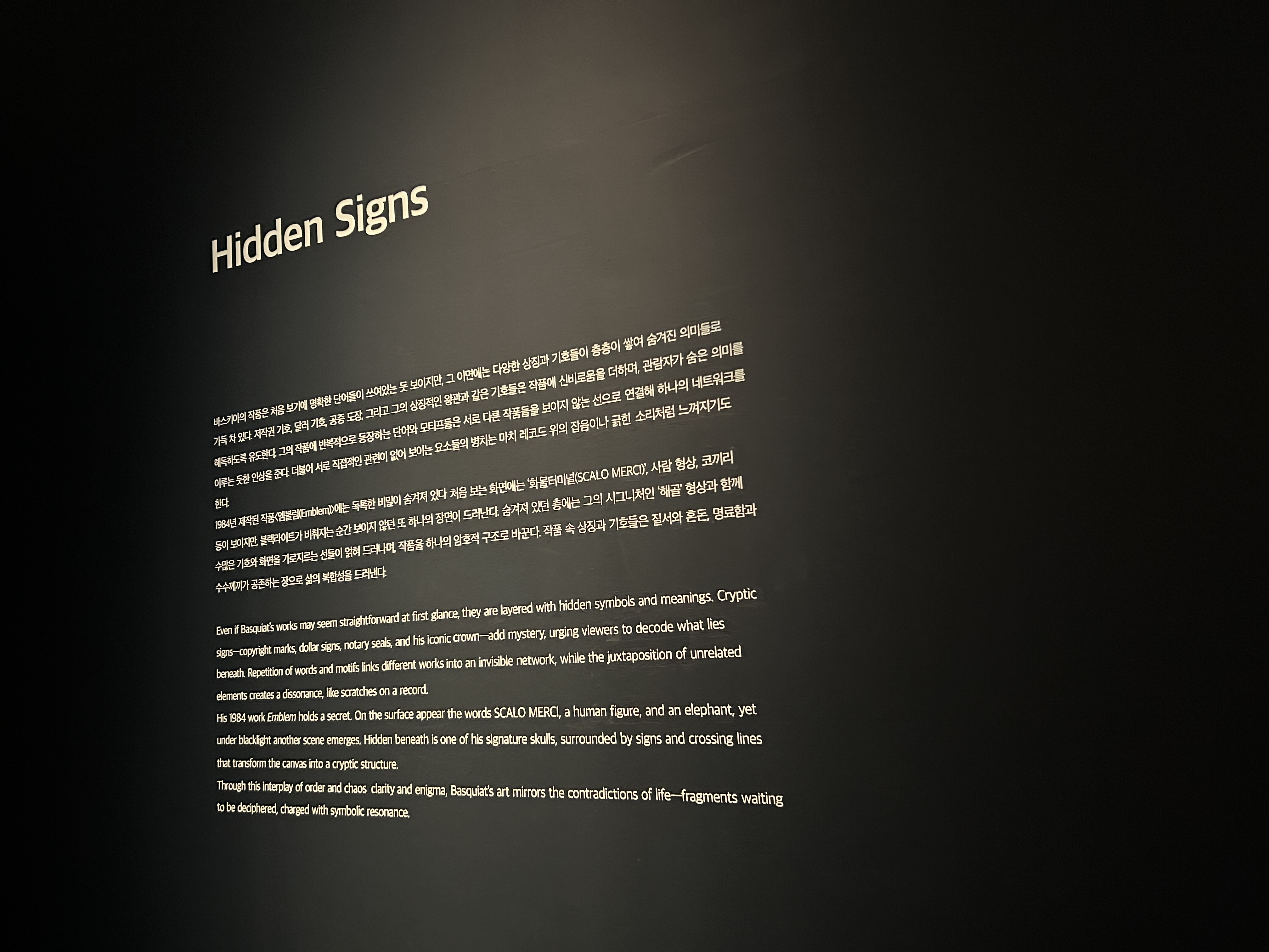 SECTION 9 숨겨진 상징 HIDDEN SIGNS, 바스키아이 작품은 반복되는 기호와 은유, 숨겨진 이미지들을 통해 삶의 복잡성과 모순을 반영하며, 관람자로 하여금 그 이면의 메시지를 이해하도록 유도하는 다층적인 시각 언어를 구성한다.