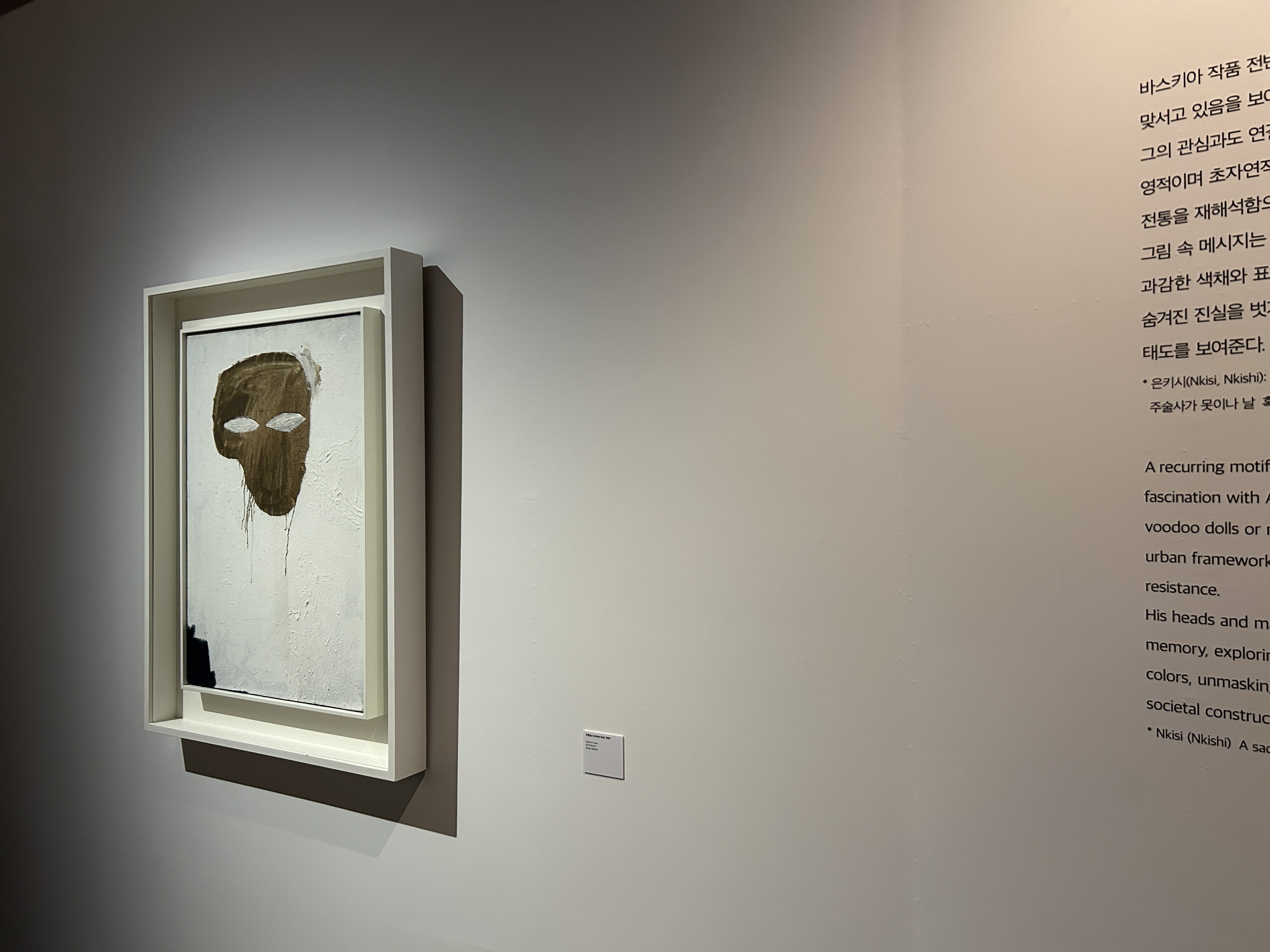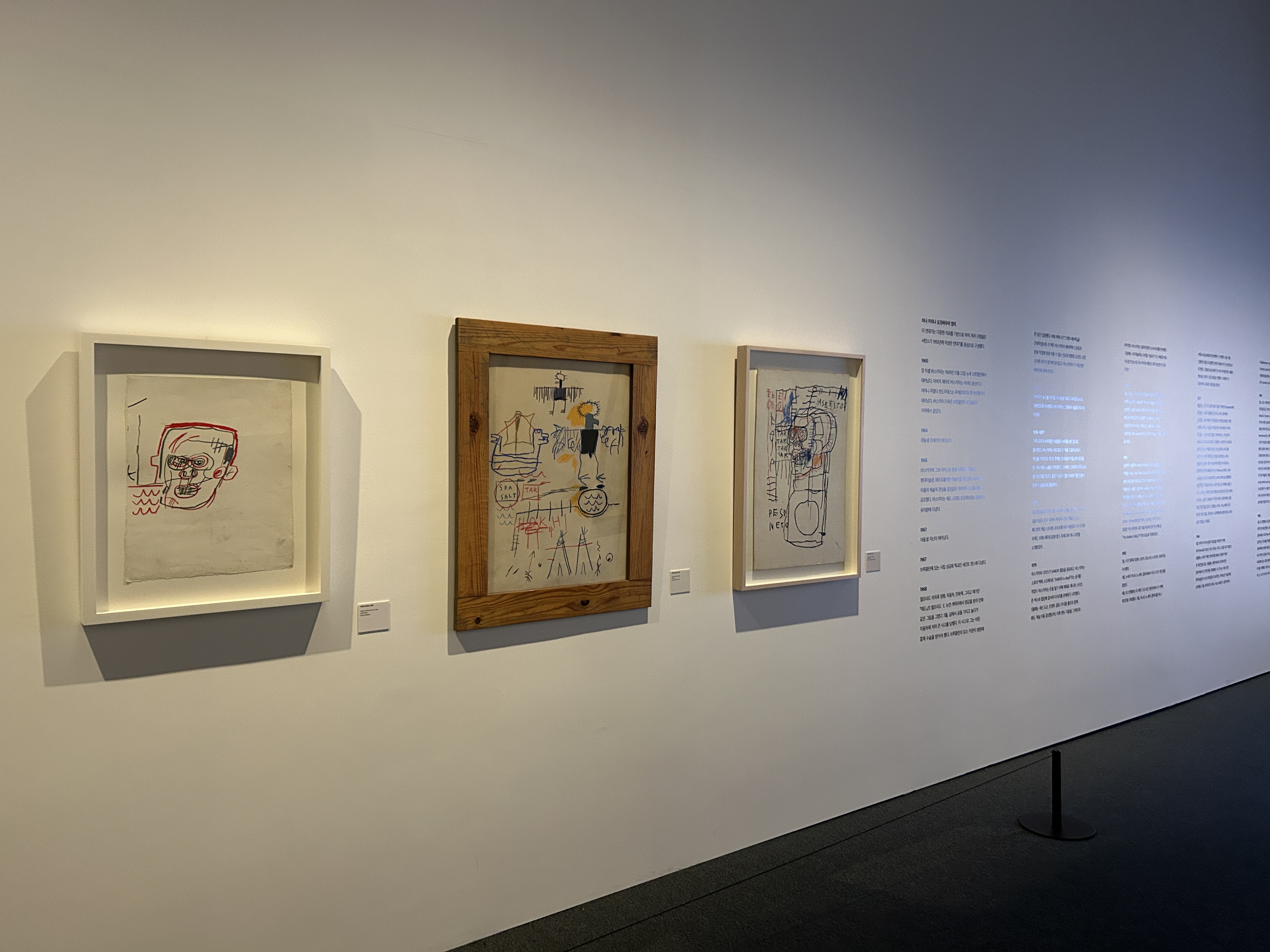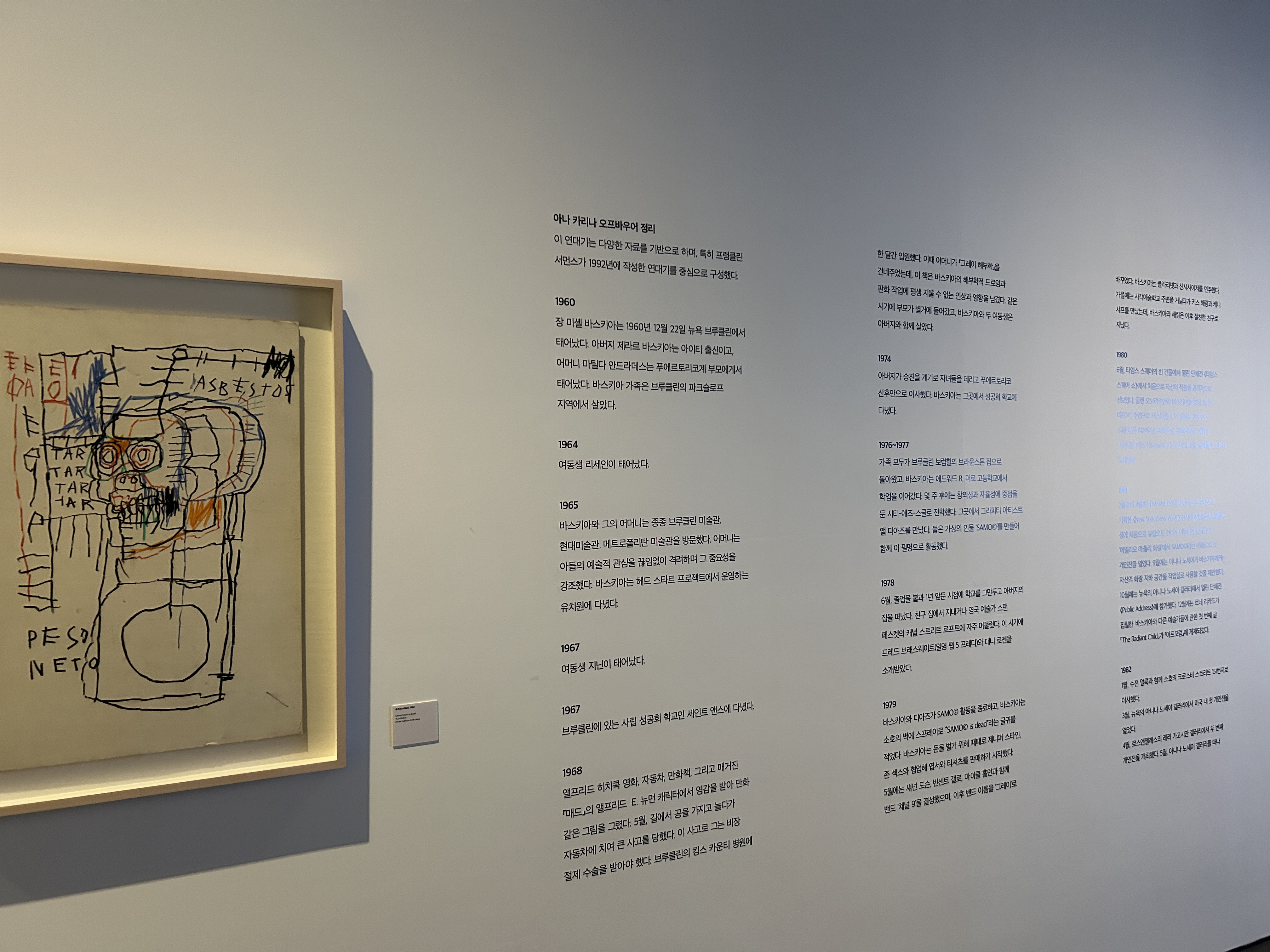 장 미셸 바스키아 Jean Michel Basquiat는 1960년 미국 뉴욕 브루클린에서 태어난 세계적인 미술가다. 그는 푸에르토리코와 아이티계 미국인으로서, 특히 어머니에게서 큰 영향을 받아 문화 예술적 재능을 키웠다. / 전시설명 중 /