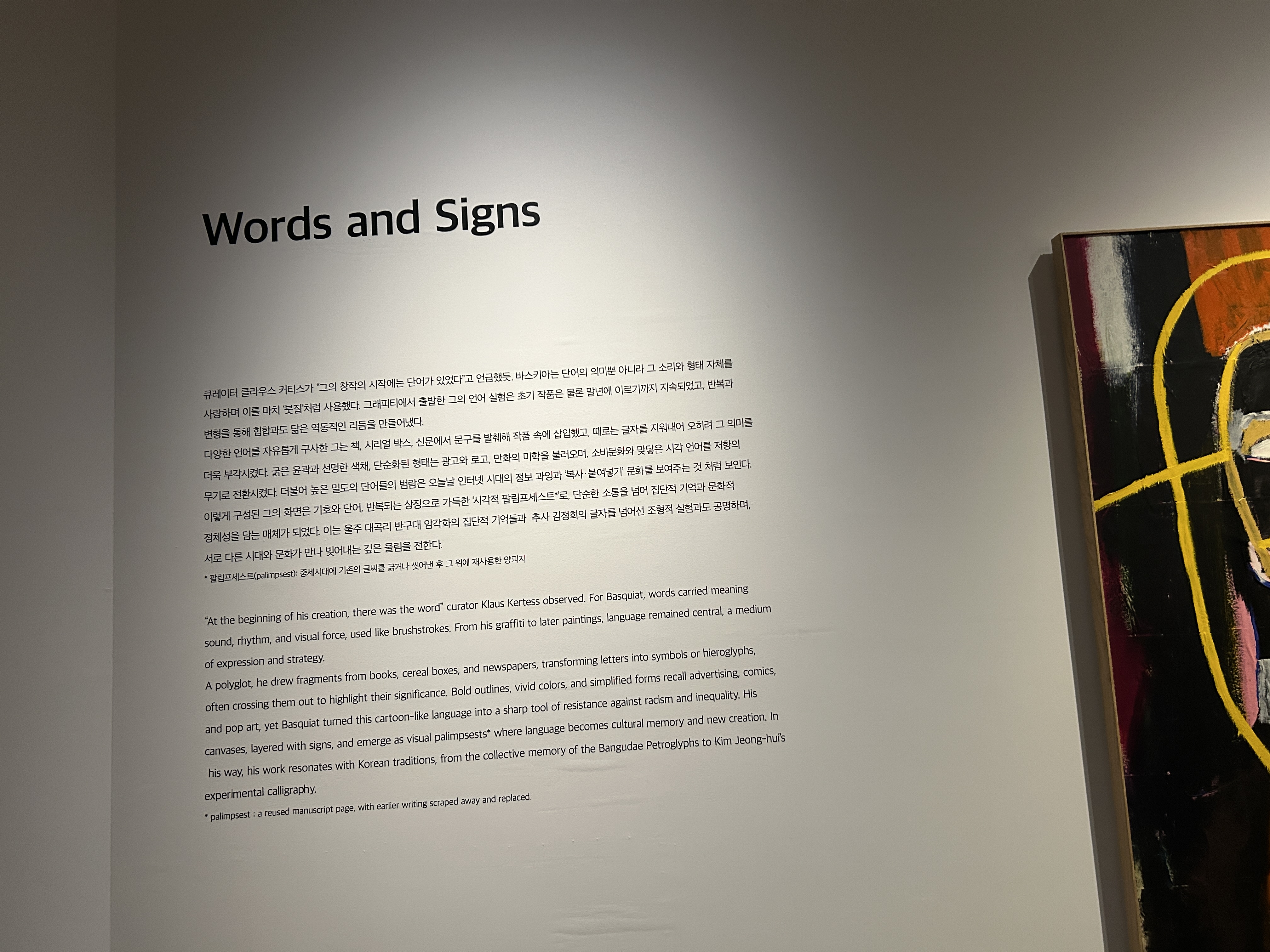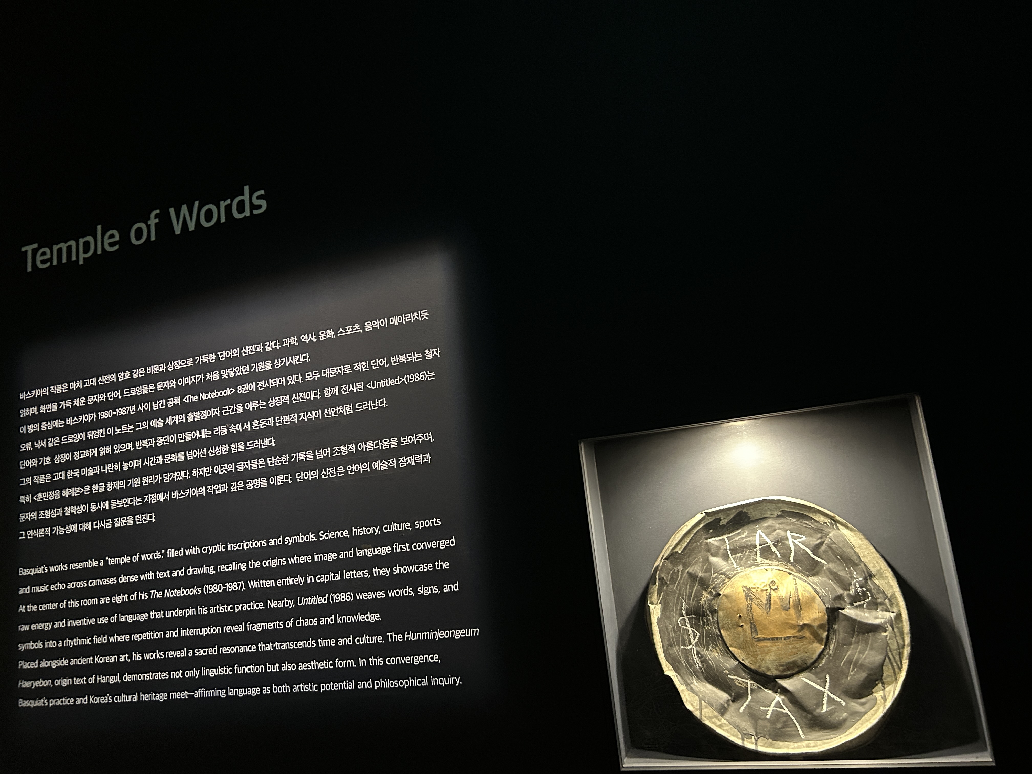 SECTION 6 는 단어와 상징들 WORDS AND SIGNS, 바스키아는 언어를 회화적 도구로 활용해 의미, 소리, 형상을 결합한 독창적 시각언어를 구축했으며, 언어를 통해 문화 정체성과 감정을 표현하는 복합적인 예술을 구현하였다.