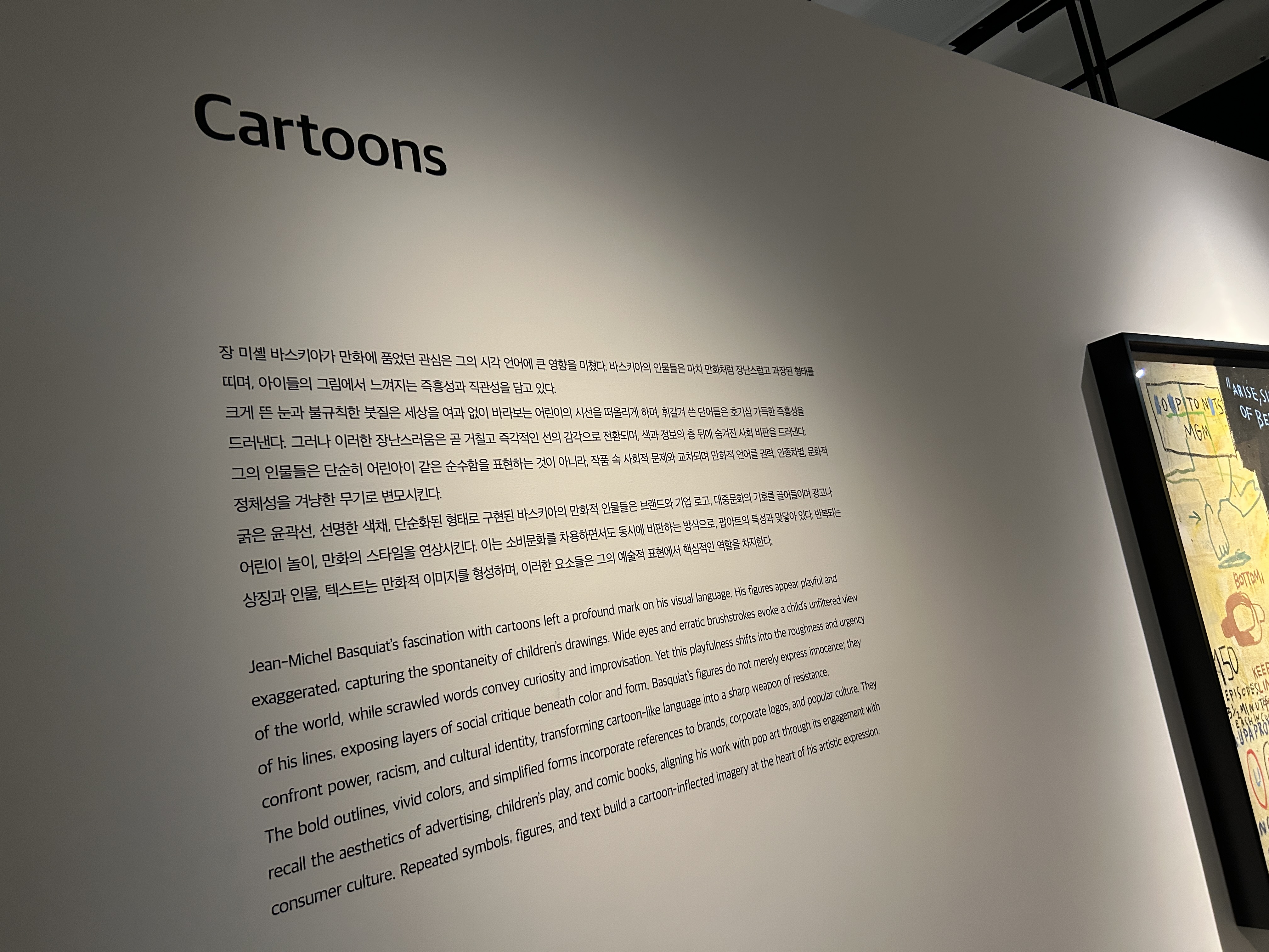 SECTION 4는 카툰 CARTONS, 바스키야가 만화적 형식과 어린이 그림의 즉흥성과 감성을 차용해, 소비문화와 대중매체를 비판하고 다양한 사회적 문제를 날카롭게 드러내는 시각언어를 구축했음을 보여준다.