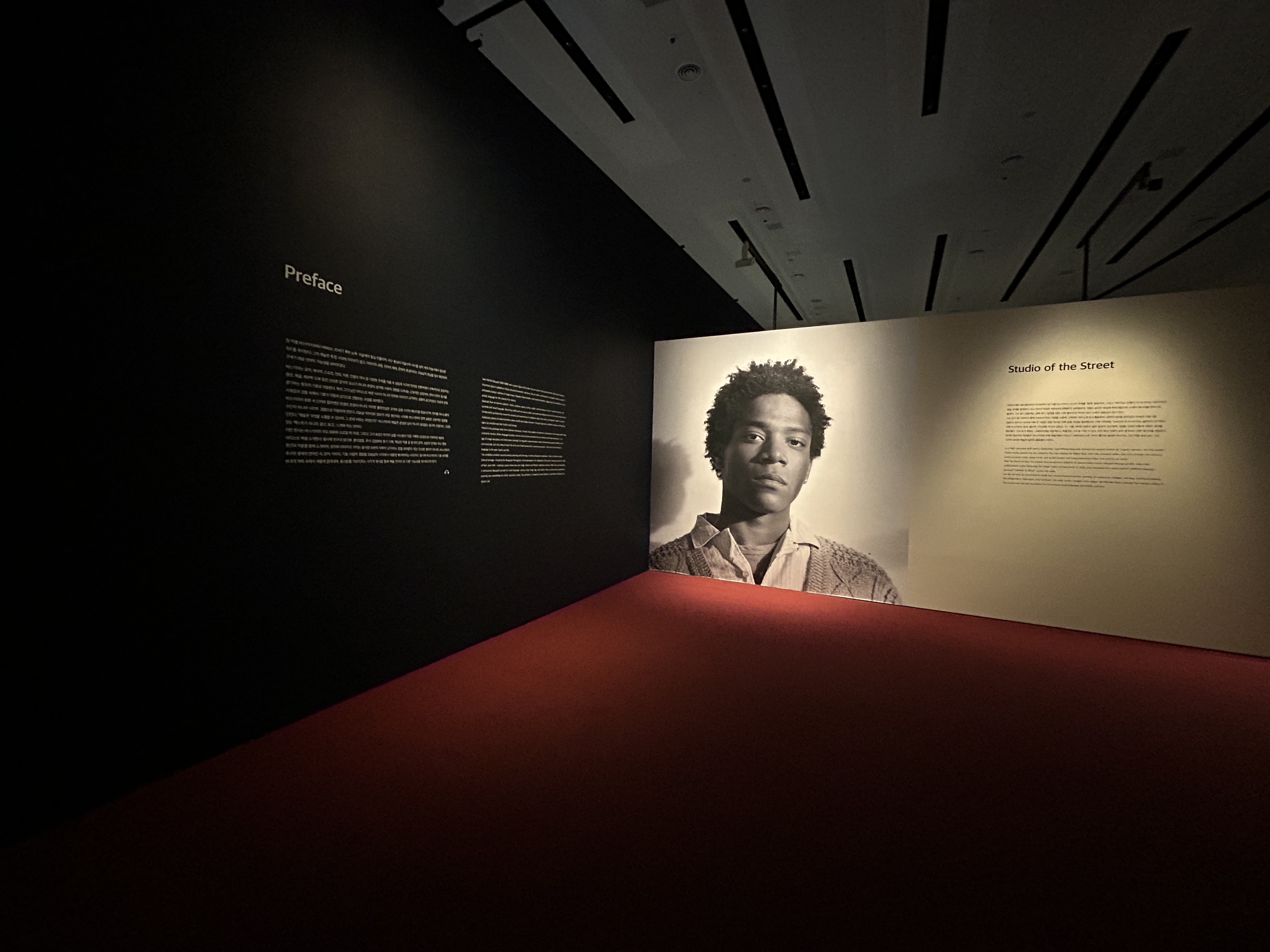 전시는 총 11개의 SECTION으로 나누어져 있다. SECTION 1은 스트리트를 스튜디오로 THE STUDIO F THE STREET라는 제목, 장 미셸 바이키아가 1980년대 뉴욕 거리의 거칠고 생생한 에너지에 자신의 정체성을 결합해, 비전통적 매체를 활용한 강렬한 시각 언어로 현대 회화의 새로운 지평을 열었음을 보여준다. / 전시 팜플렛 참고 이하 /