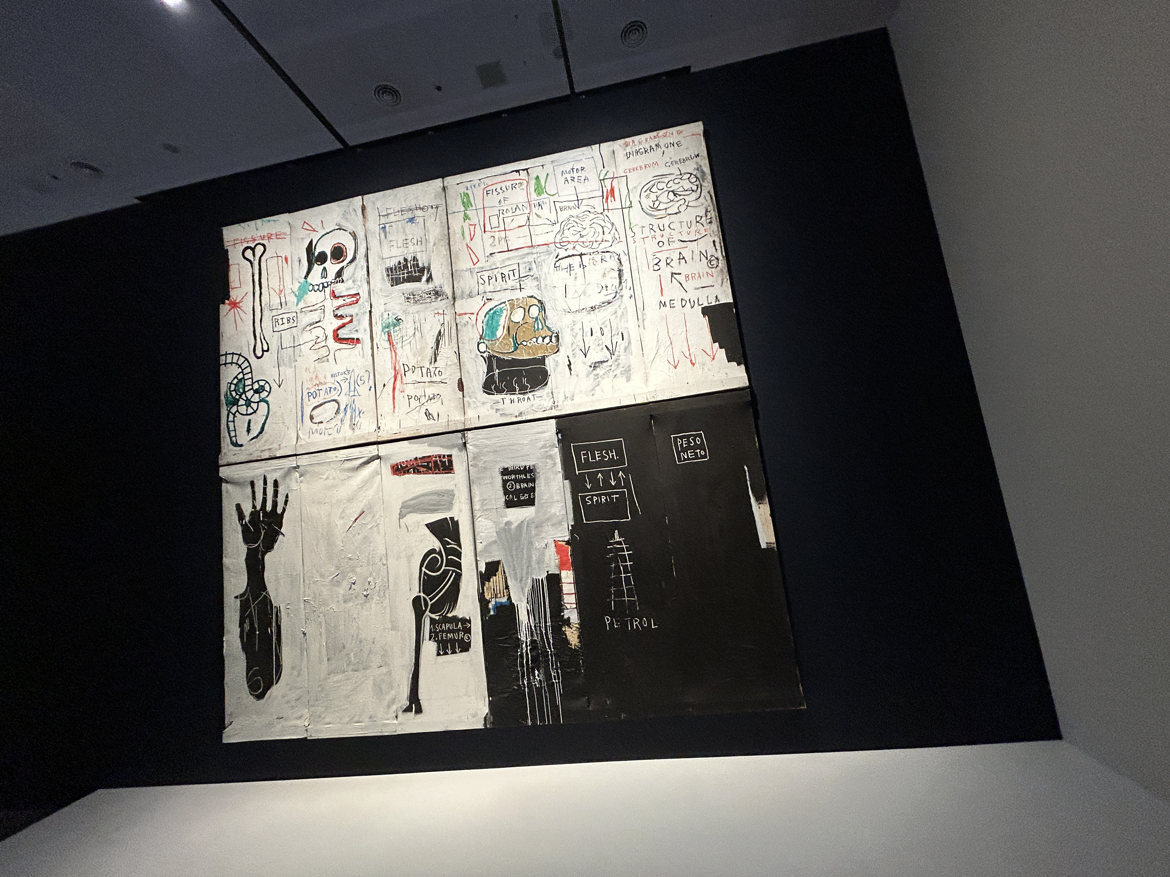 SECTION 9 해부학 ANTOMY, 바스키아는 어린 시절 사고의 영향으로 인체 내부를 해부학적으로 표현하며 정체성, 죽음, 인간의 연약함을 탐구했고, 이는 서양의 과학적 해부학과 동양의 에너지 중심적 관점을 아우르는 독창적인 예술로 확대되었다.
