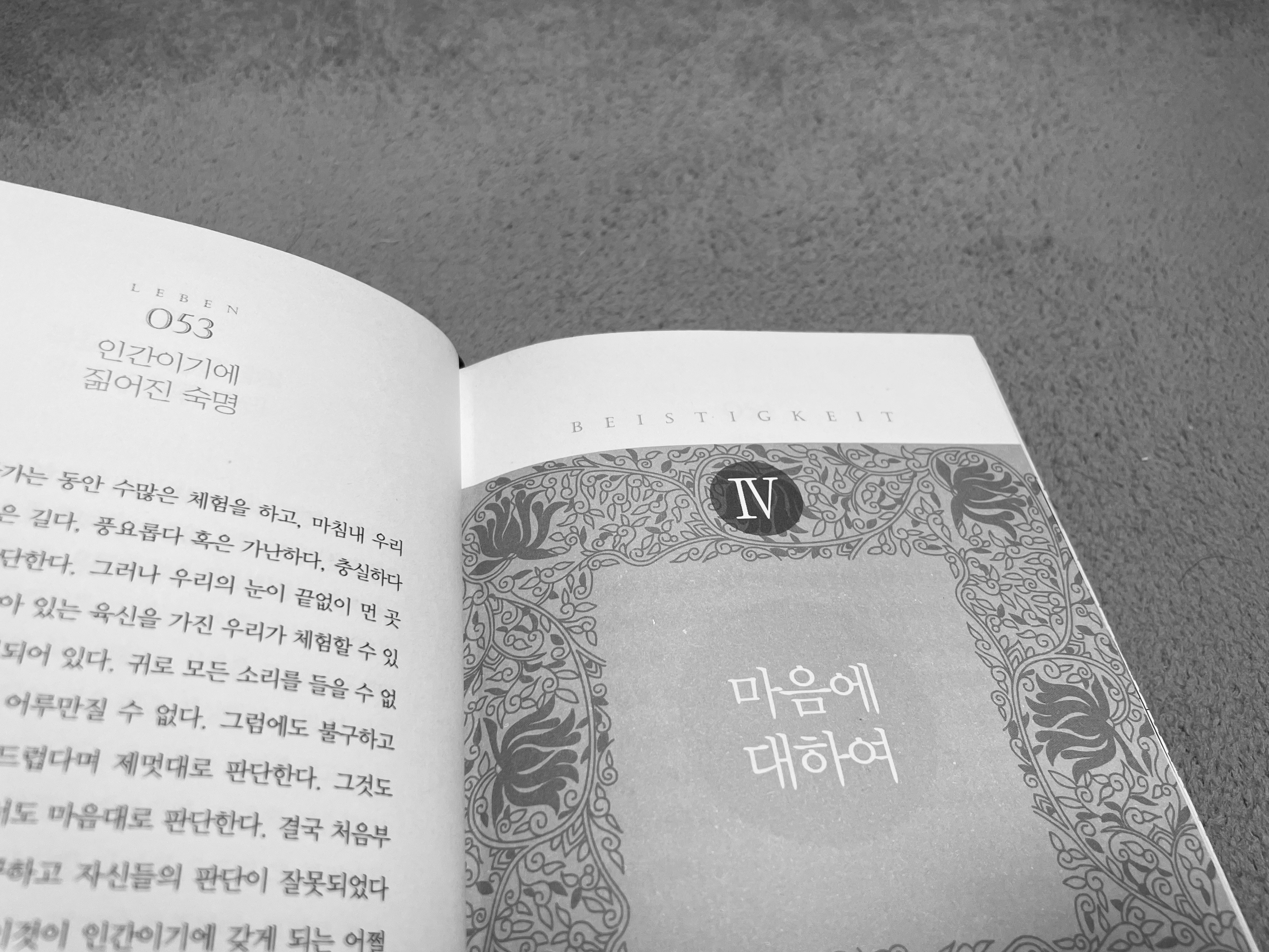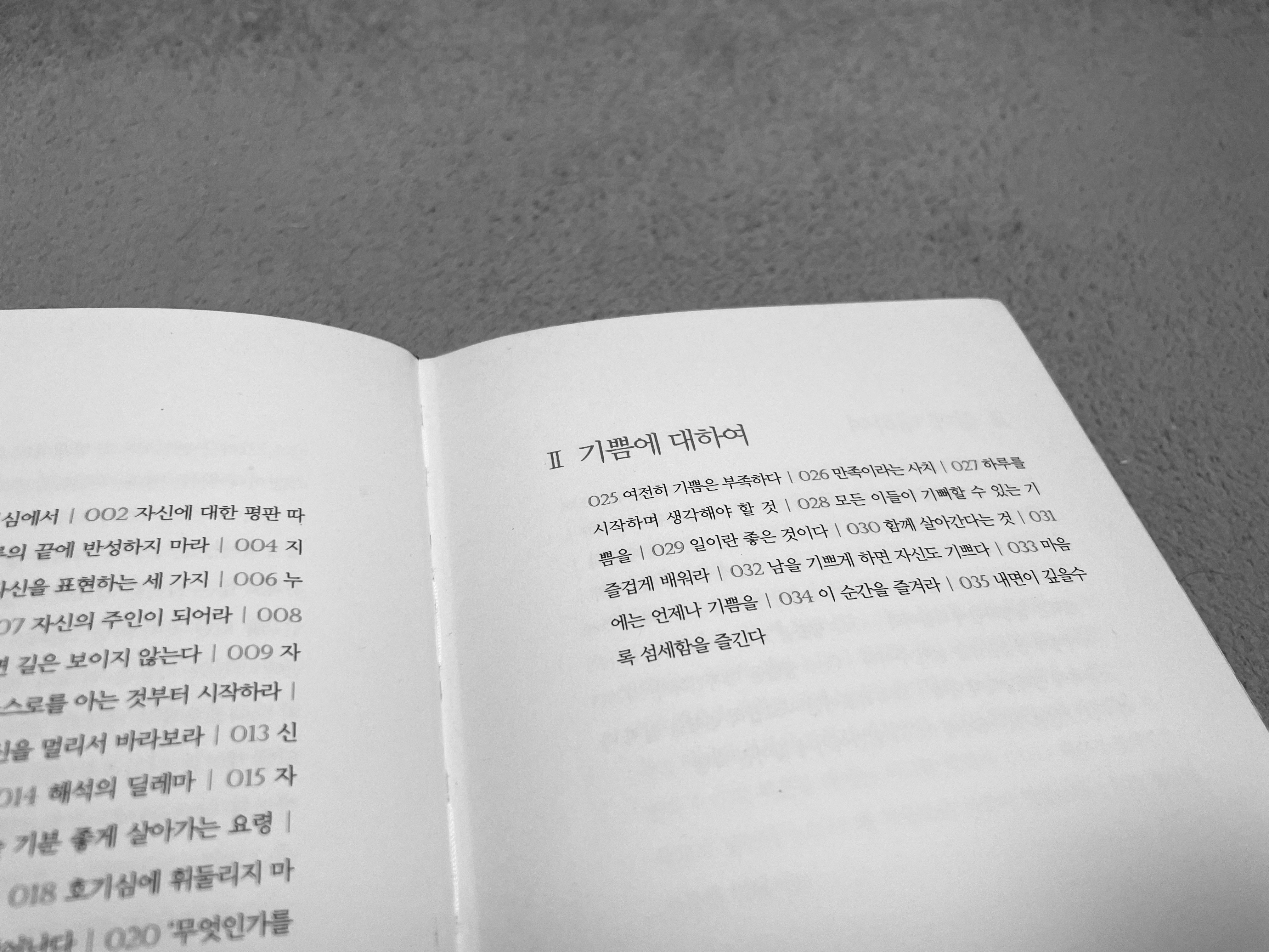 읽는 내내 글 하나하나가 소중해서 전체를 다 옮기고 싶은 마음이었다. 그리고 아껴서 읽고 싶은 생각이 들었다. 한 페이지에 담긴 짧은 글이 하루를 대하는 자세를 바꾸고, 다음 글을 읽기 전까지 생각할 거리를 만들어 준다.