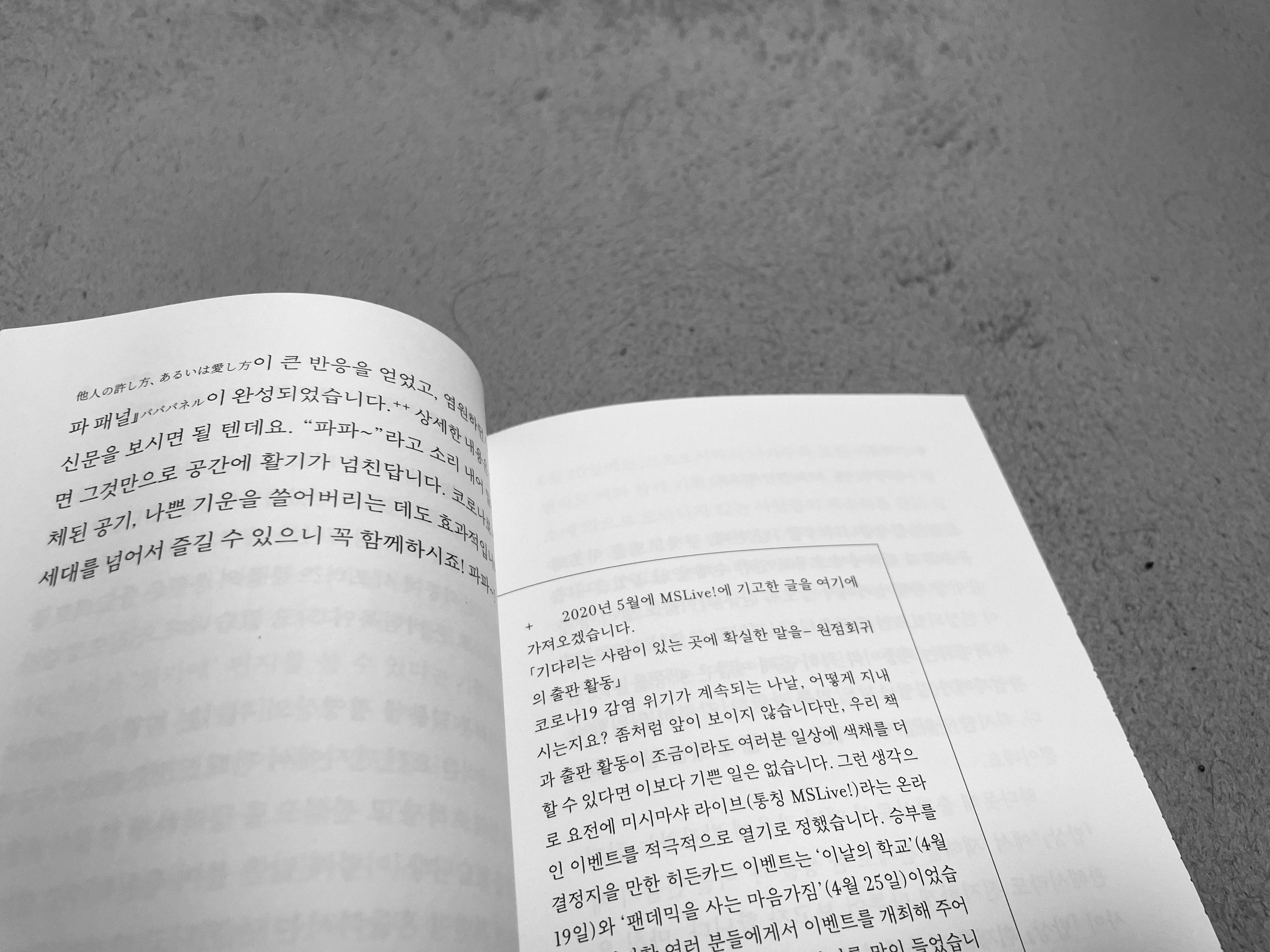 이 책은 미시마 사장이 미시마샤 출판사의 서포터들에게 보내는 글들로 구성되어 있다. 그는 서문에서 한 회사의 시련과 극복, 성장에 대한 내용 같은 건 담겨있지 않다고 말하지만 그의 글 속에는 그의 고민과 당장 닥쳐있는 현실의 문제, 회사와 구성원들의 극복과 성장이 고스란히 담겨있다. 또한 그가 신념을 실행하는 과정에서 빼놓고 이야기할 수 없는 환경, 현대의 사회에 대한 고민까지도.