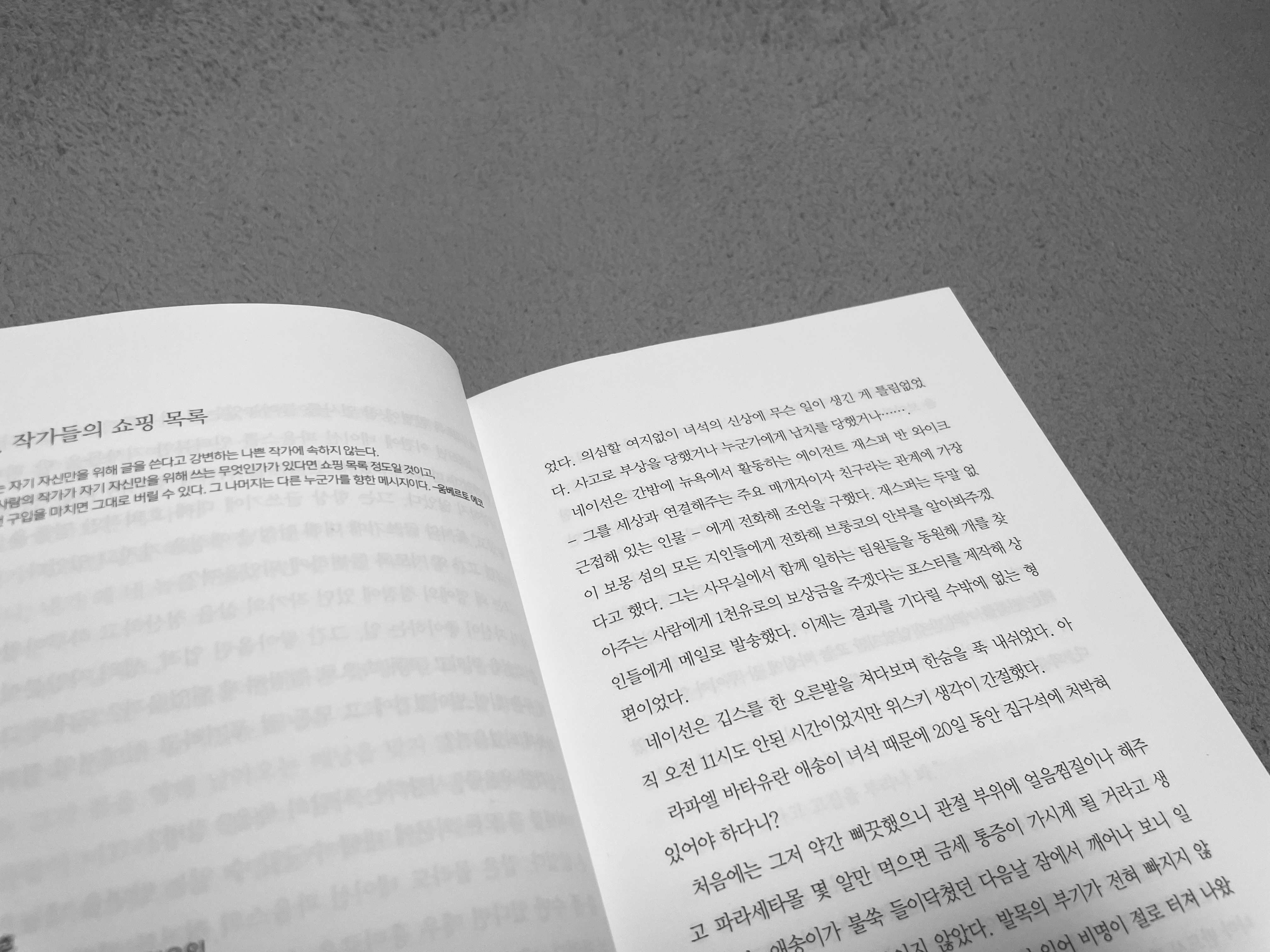 이 책이 작가가 되는 방법을 설명한 자기개발서가 아니라 소설, 그러니까 허구의 이야기임을 알고 있었음에도 불구하고 선택한 이유는 사실 책의 제목 때문이었다고 고백한다. 사실 나는 작가들의 내면이나 뭔가 감추고 있는 것처럼 보이는 비밀스러운 뒷마당에 관심이 많았다. 거기에다 그런 것들을 알게 되고 뭔가 흉내를 내다보면 나도 글을 잘 쓸 수 있을 것이라는 근거 없는 기대감도 물론 한 몫 했다.
